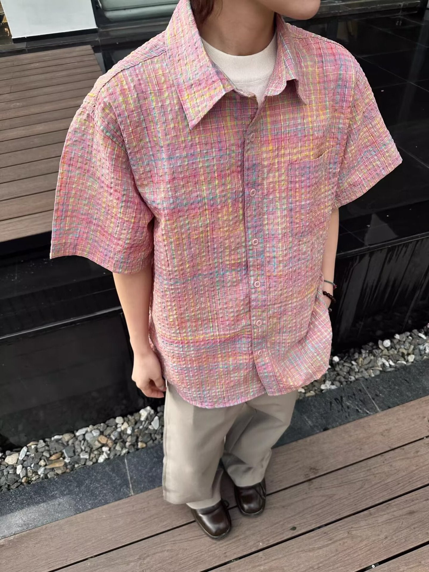 This men's multi-color plaid short sleeve shirt blends vibrant colors with a lightweight fabric for a relaxed summer vibe. The fine plaid pattern features intertwined pink, yellow, and blue tones, adding depth and visual interest. Designed in a loose fit with breathable fabric, it keeps you cool and stylish in warm weather. Whether for daily outings, holiday travel, or casual gatherings, it’s a versatile piece that fits seamlessly into your wardrobe.